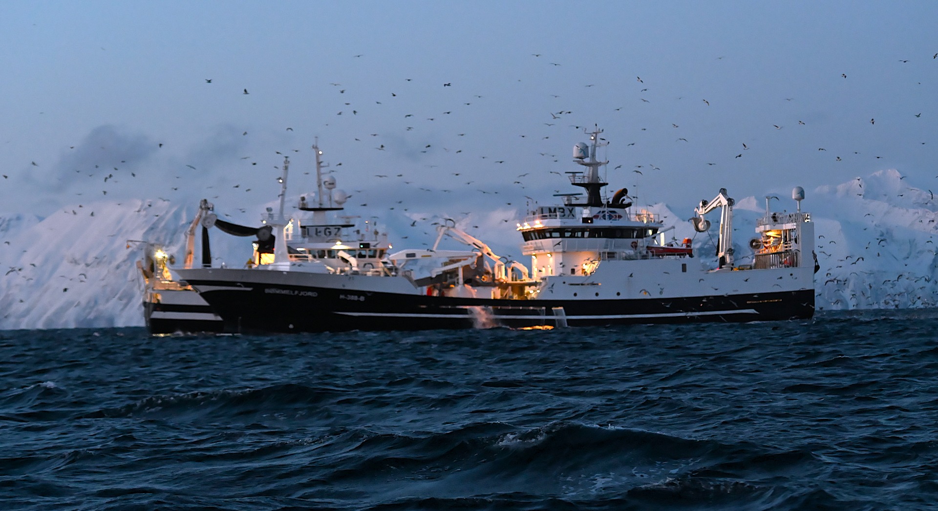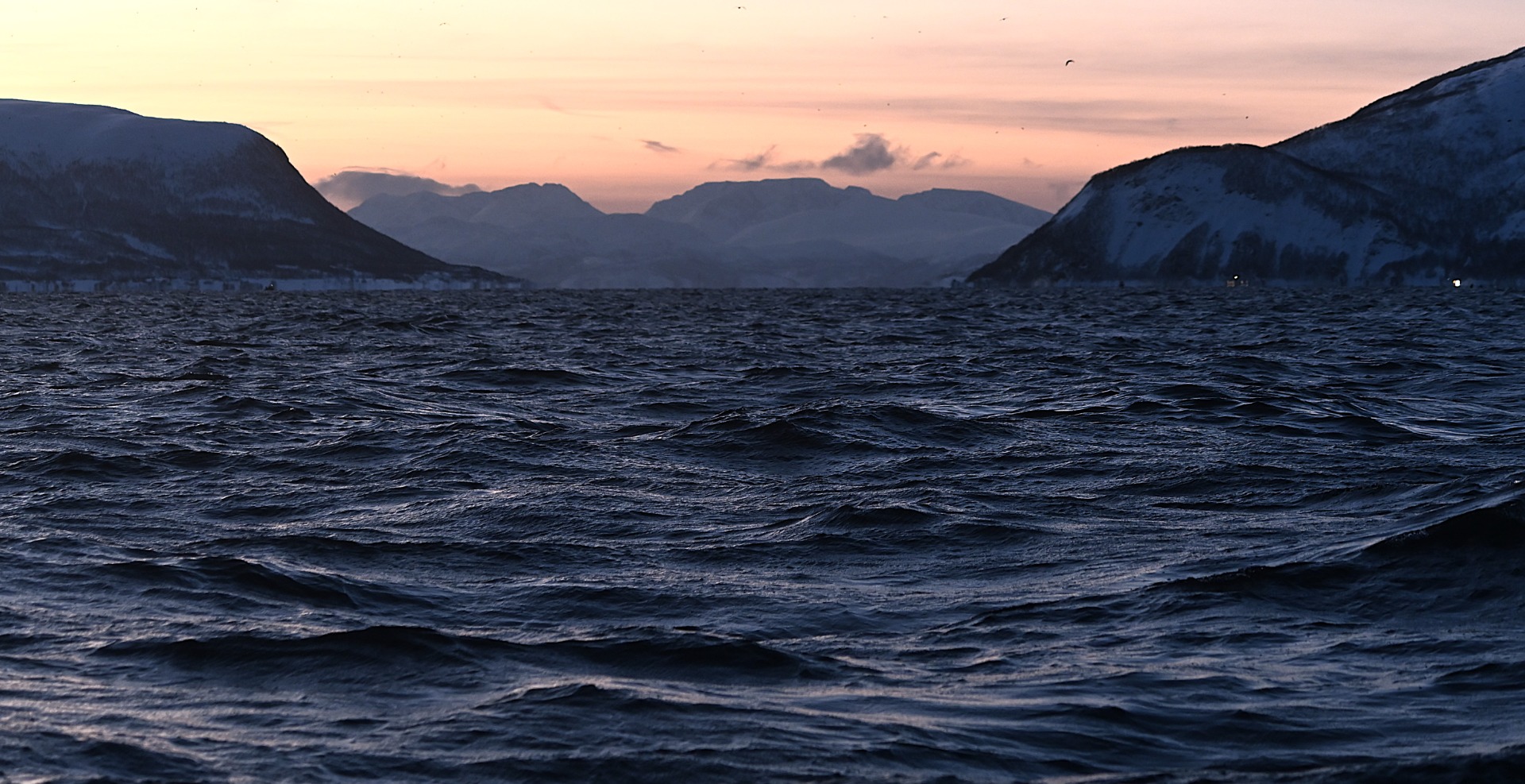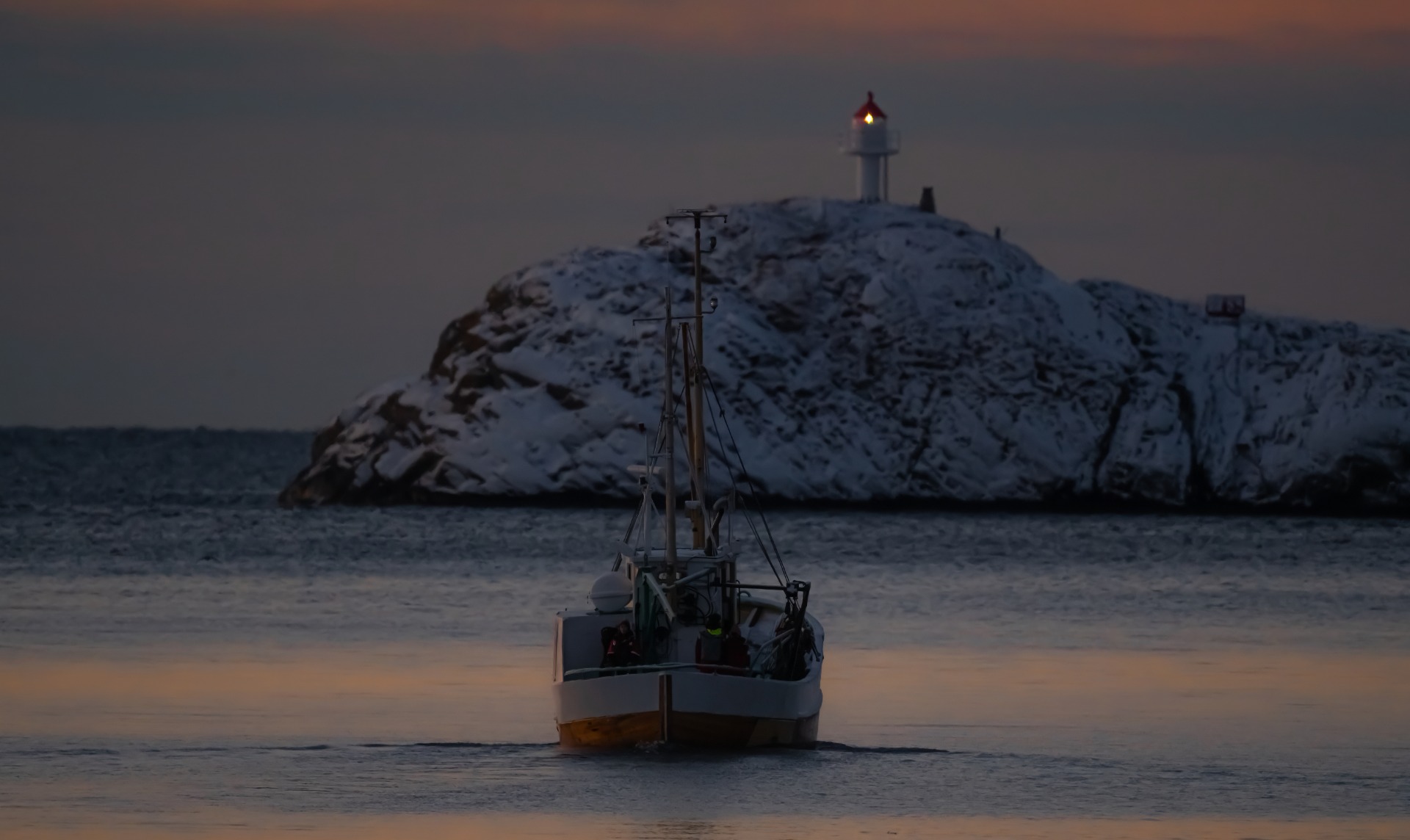 Meri liikkui hämärässä hiljaa 6 m/s. Oli hämmästyttävän tyyni aamu. Perävanaa jäi jälkeemme merimaili toisensa perään. Vuonojen suulla oli kevyttä ristiaallokkoa eikä merikiikareiden linssiin tarttunut juuri mitään. Ei edes sitä odotettua lokkiparvea kaukaisuudessa, joka merkkaisi silliparvien sijainnin.