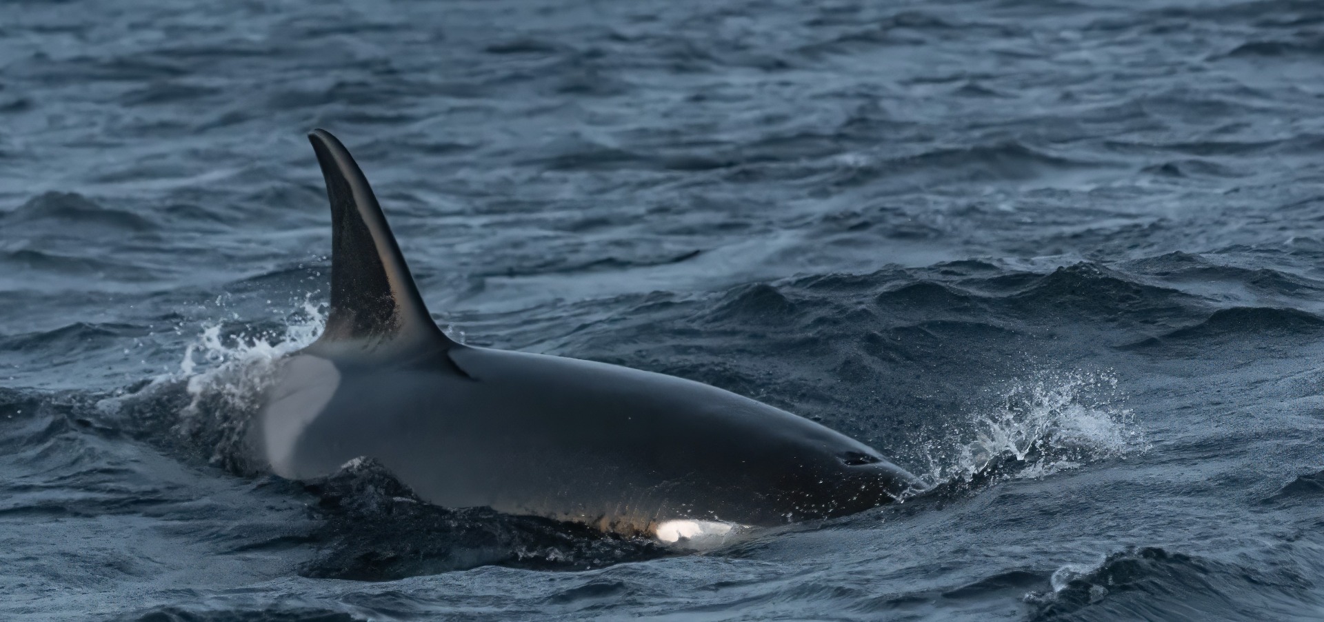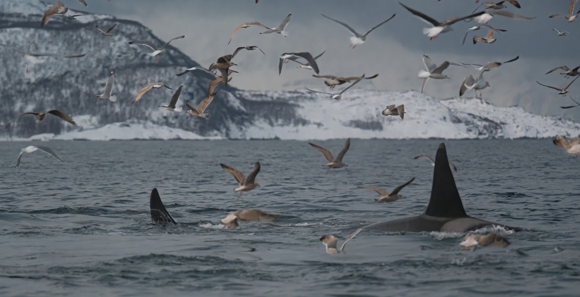 Matkalla syvänteille kiikareihin osui parvi lintuja ja siellä näkyi myös muutamia miekkavalaiden eviä syöksähtelemässä nopeutuvassa tahdissa. Metsästys oli alkanut, mutta samalla veneen ohi liukui viiden ryhävalaan parvi joiden suora suunta oli samaan paikkaan. Tuli hieman kiire ja parkkeerattiin purkki juuri oikeaan paikkaan syvänteen reunalle kun todellinen luonnonnäytelmä alkoi.