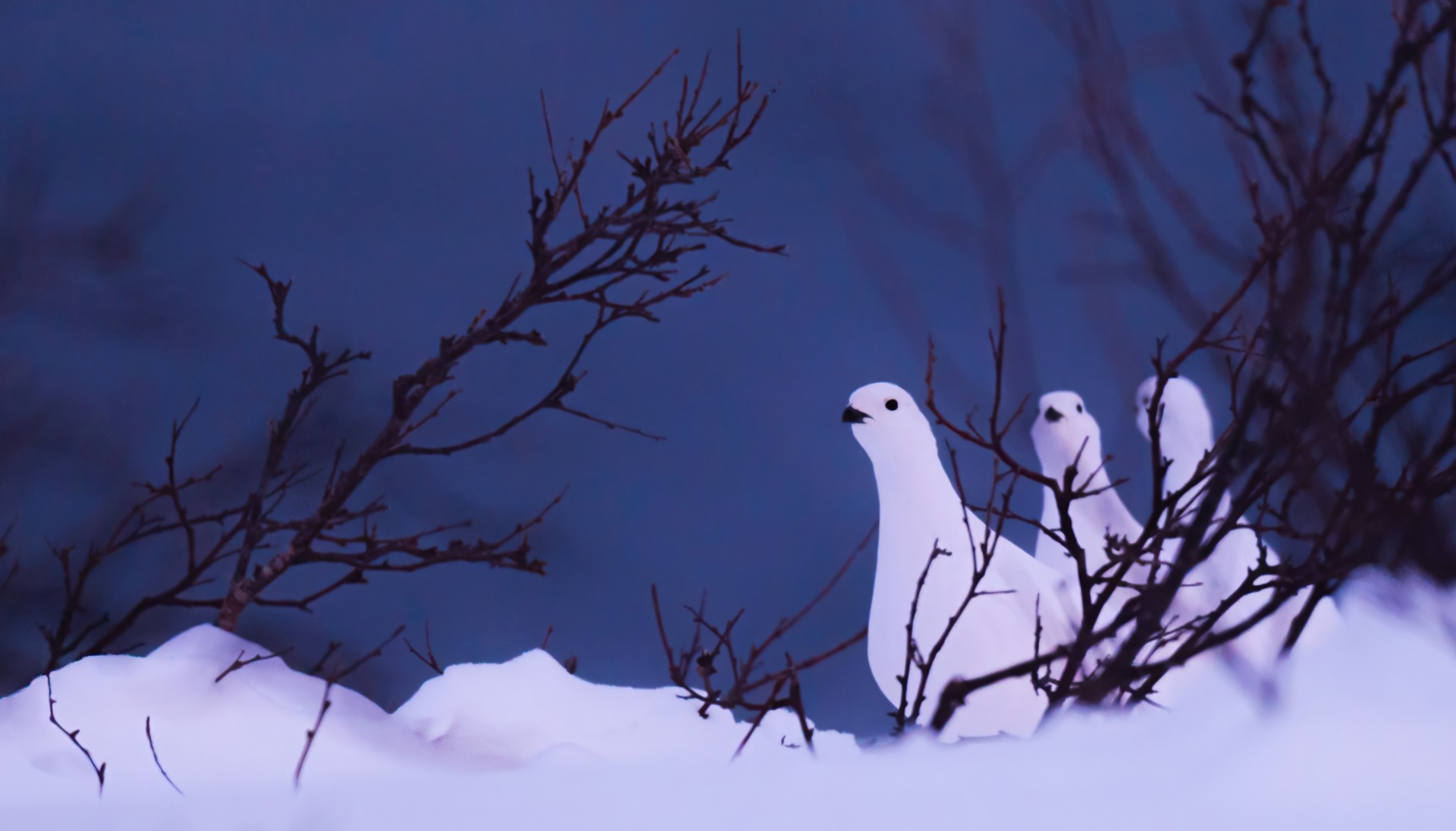 Sinisiä tunturirinteitä vasten liikkuvat riekot kävivät vaanimassa kuvaajaa. Uteliaisuus oli suurta, mutta kaivamaani hankikuoppaan kukaan ei heistä kuitenkaan halunnut.