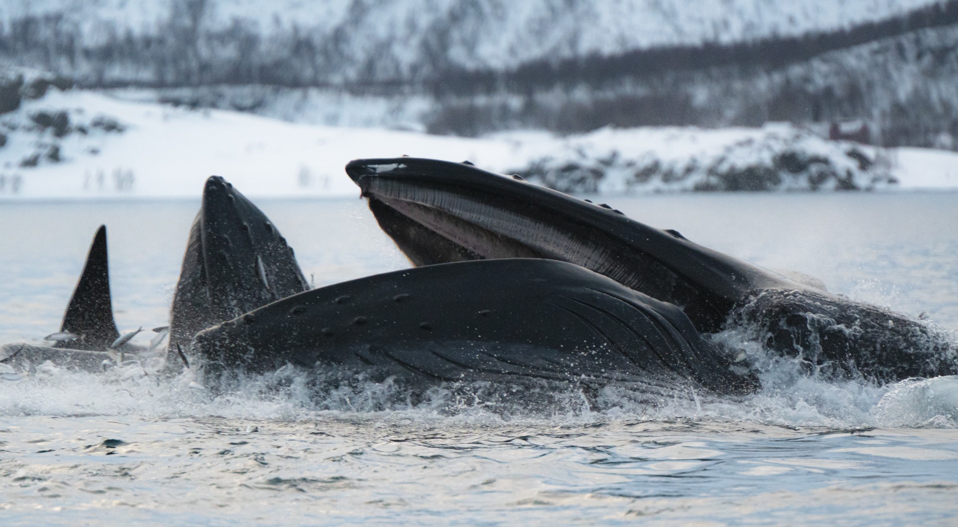 Veden paine tuntui kuivapukua myöden kun kolme ryhävalasta syöksyi syvyyksistä lähes paatin vieressä ja kaikki kolme putosivat samaan kasaan päällekäin, alimmaisen ollessa onnekkain ja saaden hetulat täyteen silliä. Valtava suu puristi silliparvea, päällimmäisen valaan teutaroidessa saaliin jaolle mutta turhaan...