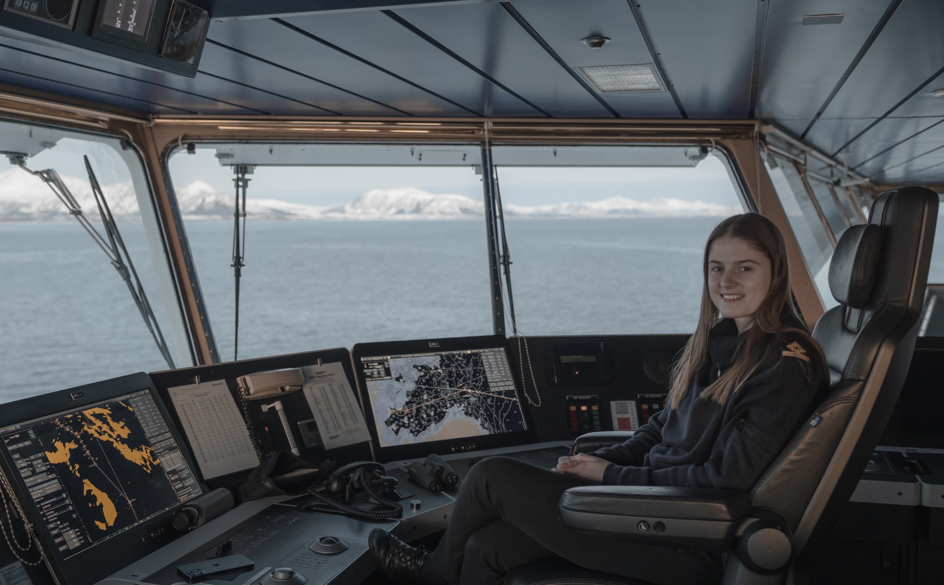 Sain suuren kunnian päästä aamiaiselle legendaarisen Hurtigrutenin komentosillalle päällystön kanssa, II perämies Nadia Frostad esitteli mieluusti työpaikkaansa ja kertoili päällimmäiset kuulumiset. Sitten loppui hauskuus kun kippari jahtasi kaikki töihin ja lähestyttiin aamun ensimmäistä etappisatamaa.