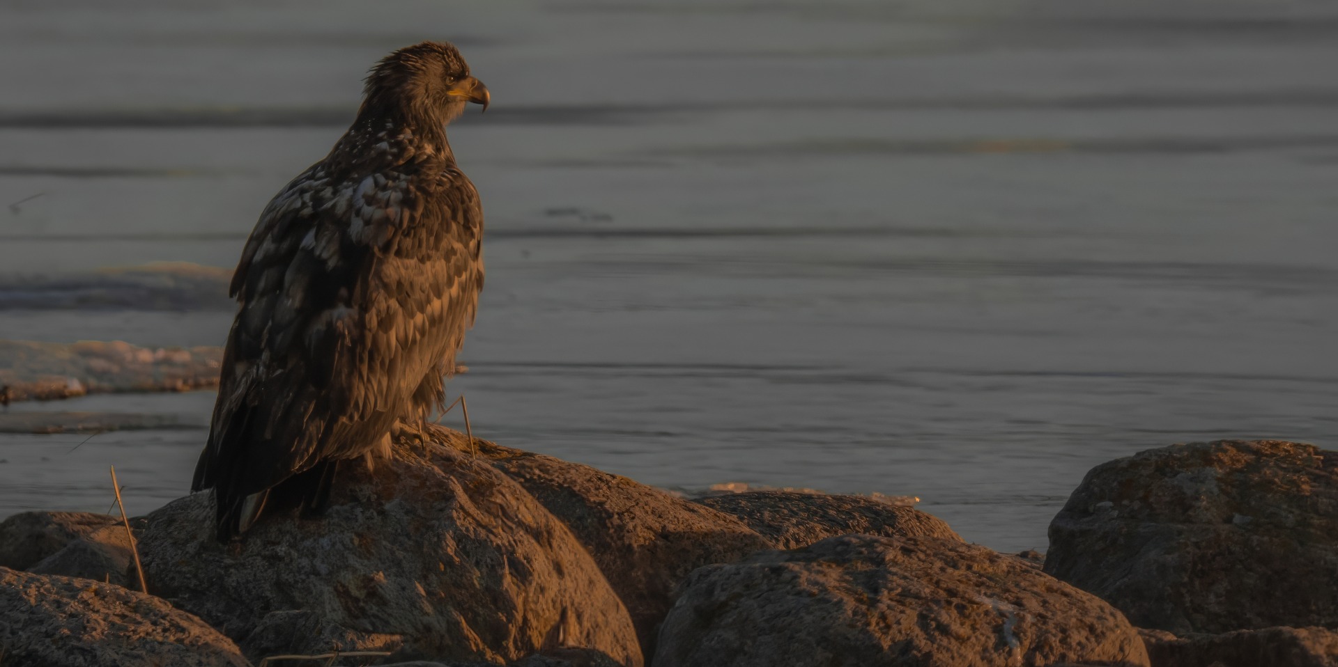 Iltapäivän valossa istui nuori merikotka kivellä tutkien lammen pintaa joka poikkeuksellisesti oli ohuessa jääriitteessä.