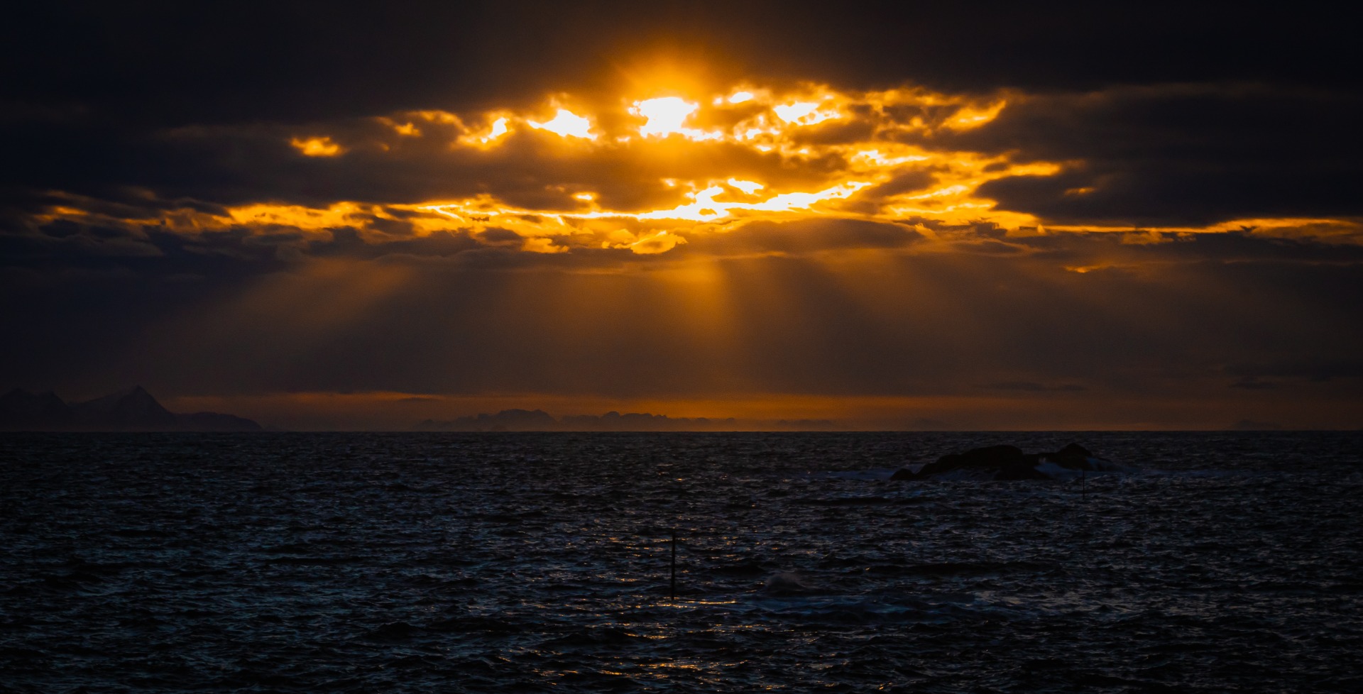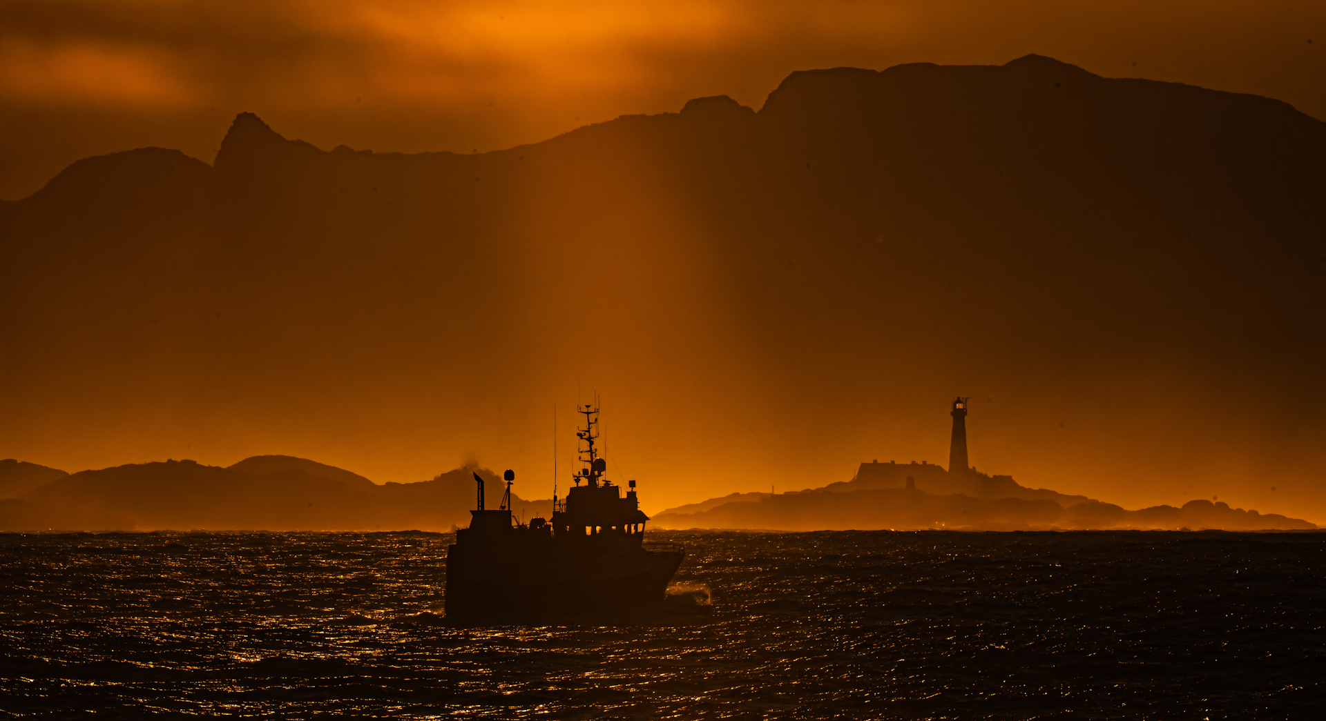 Saaren rannat jäävät taakse, keula avomerelle, kevyttä heijastetta taivaalla joten valoa riittää yli tunniksi.